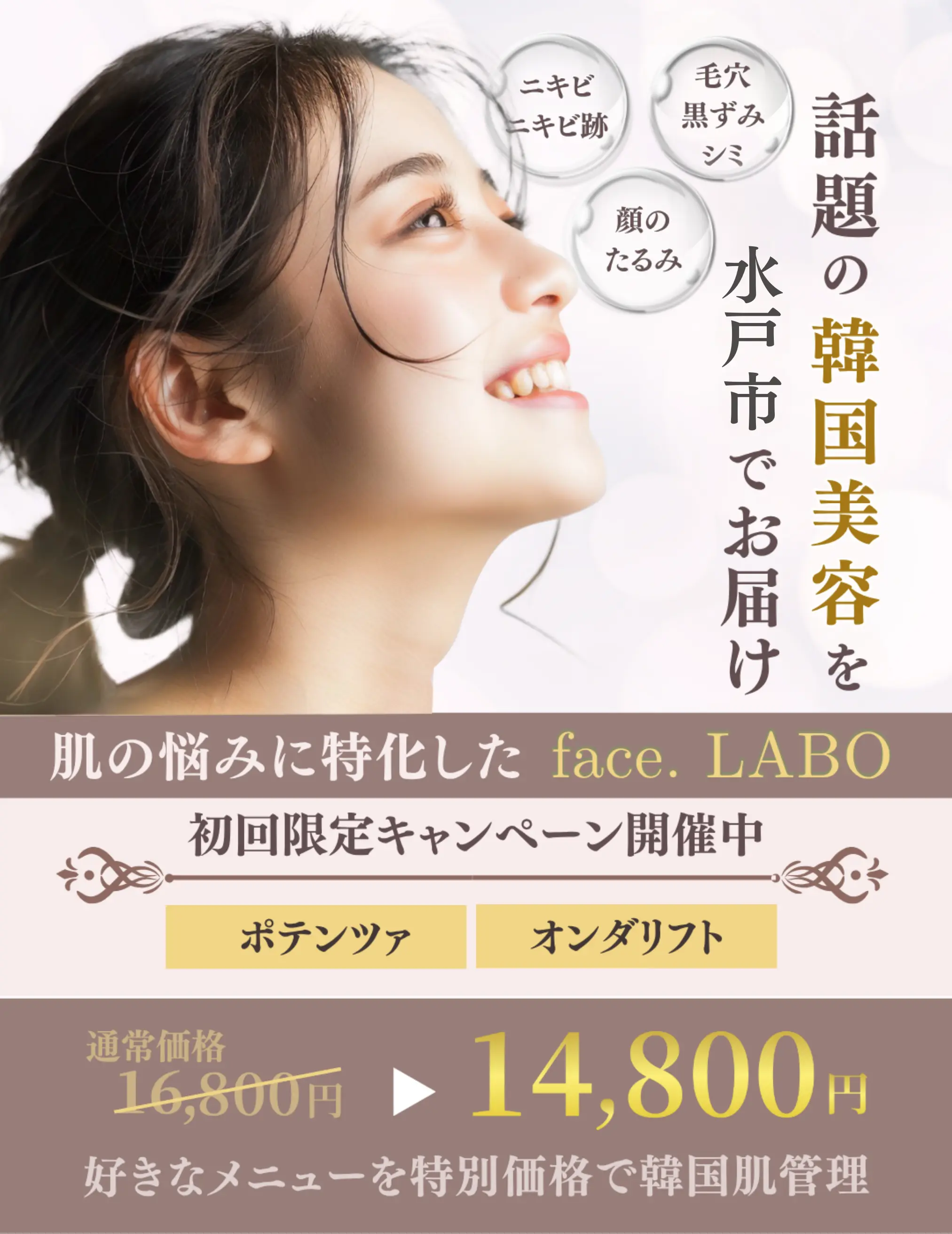 水戸市で渡韓せずに話題の韓国美容が受けられる。韓国クリニックで取り扱いのある高濃度リジュランでニキビケア、赤み、ハリツア肌を作り、韓国で話題のマシンポテンツァでニキビケア、たるみケアなら韓国で話題のオンダリフト。ニキビ、ニキビ跡、毛穴、肝斑、しみ、たるみ、フェイスライン、あらゆるお顔の悩みに応えるメニューをご用意しております。